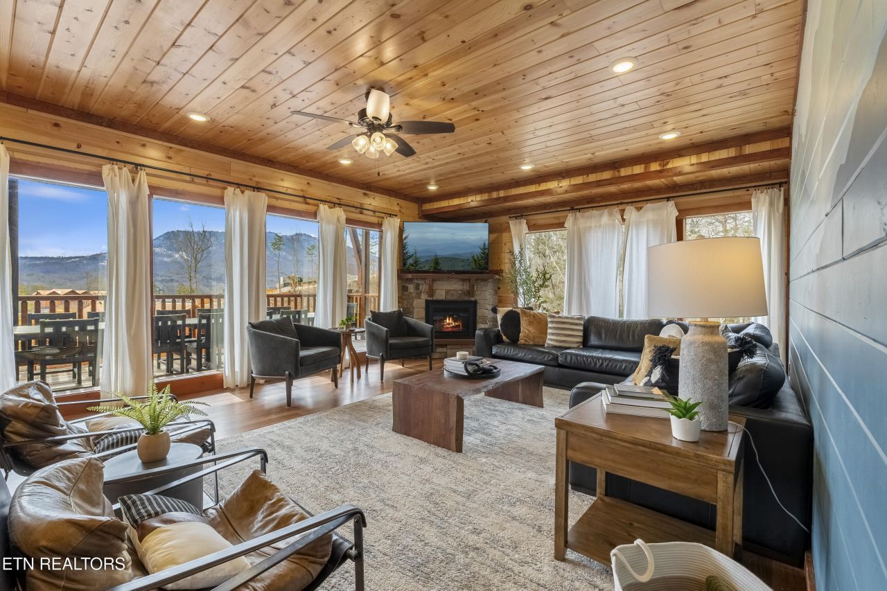 FULLY SPRINKLERED 6 BD STR w/ Indoor Pool & $192k in Gross Revenue! This income-producing short-term rental comes fully furnished and packaged with top tier amenities designed to outperform in today's STR market. The main level features a chef's kitchen with full-size appliances, granite countertops, and an oversized island with bar seating, flowing seamlessly into a dining area with live edge bench seating and a spacious living room with indoor fireplace and large TV. Four king ensuite bedrooms include king beds, TV's, twin beds with trundles, and private full bathrooms, while two additional bedrooms each feature two queen over queen bunks, TVs, and full ensuite baths. The lower level is designed for premium guest experiences with an INDOOR HEATED POOL, game room with POKER TABLE, ARCADE GAMES, and FOOSBALL, plus a dedicated MOVIE THEATER with a smart TV and convertible sleeper sofas. A large covered multi-level back deck overlooking mountain VIEWS provides a private HOT TUB, swing seating, outdoor dining, and a propane grill. Fully furnished and turnkey, this cabin is positioned for high occupancy year-round, attracting multi-family groups and large parties seeking resort-style features.